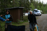 Dagen ägnades helhjärtat åt jakten på fiskelyckan....men vi lät oss luras av öringen återigen å dansken han fick sko sig till Sussies förtret........ Då hon tillfälligt kapitulerat och slagit sig till ro på en sten får hon syn på ett par gestalter som närmar sig på stigen. Detta just som Sandberg är i full färd med att dra ner byxan för en kisspaus varpå hon ropar; "Elin!!! Det kommer pojkar! ....Ifall du vill vänta lite!?"